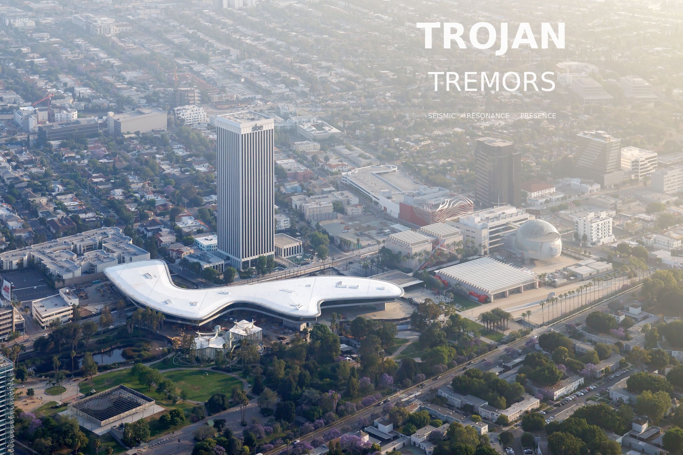 Los Angeles is built on seismic ground. The earth beneath it is already composing — vibrations that propagate through granite, refract through sand and hidden water, with or without witness. The San Andreas, the Newport-Inglewood, and the Hollywood fault systems older than anything built above them. No one is listening. Sounds of Seismic (SOS) was built to change that: a granular synthesis engine fed by EarthScope's global seismic sensor network, translating the earth's raw data stream into evolving electronic music in real time. This is musification: the earth composes, the algorithm interprets, the human body completes the meaning. TROJAN TREMORS points the SOS engine at a building already listening.